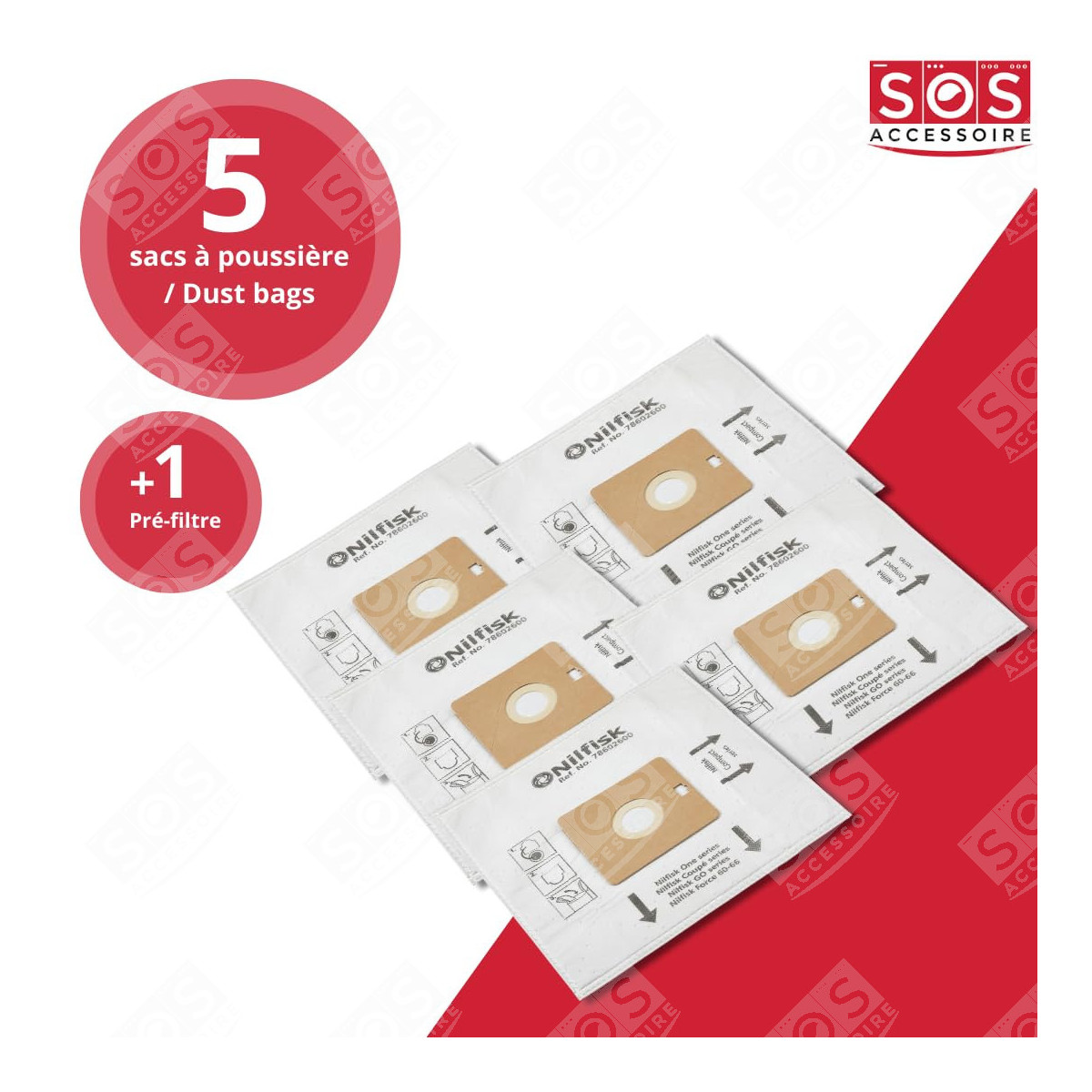 Lot de 12 boîtes de 5 sacs avec 1 pre filtre COUPE/COMPACT/GO/FORCE Compatibles pour Aspirateur NILFISK